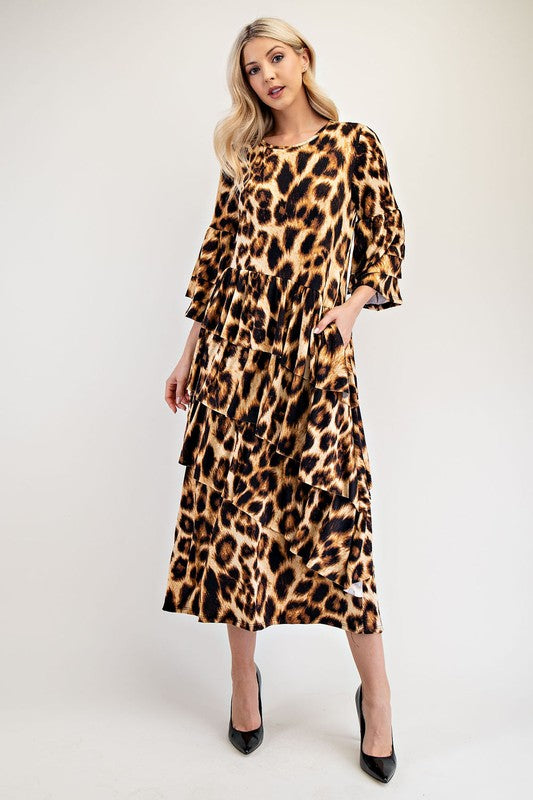 Celeste Full Size Leopard Asymmetrical Ruffle Midi Dress Plus Size