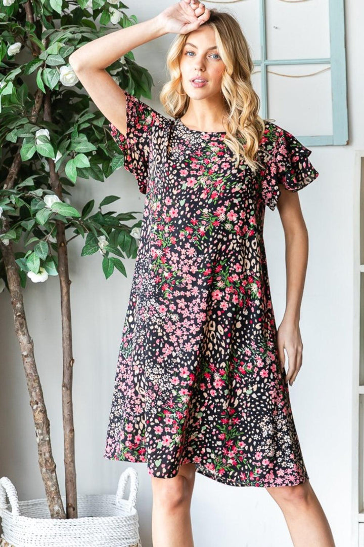 Heimish Full Size Printed Ruffled Short Sleeve Dress with Pockets