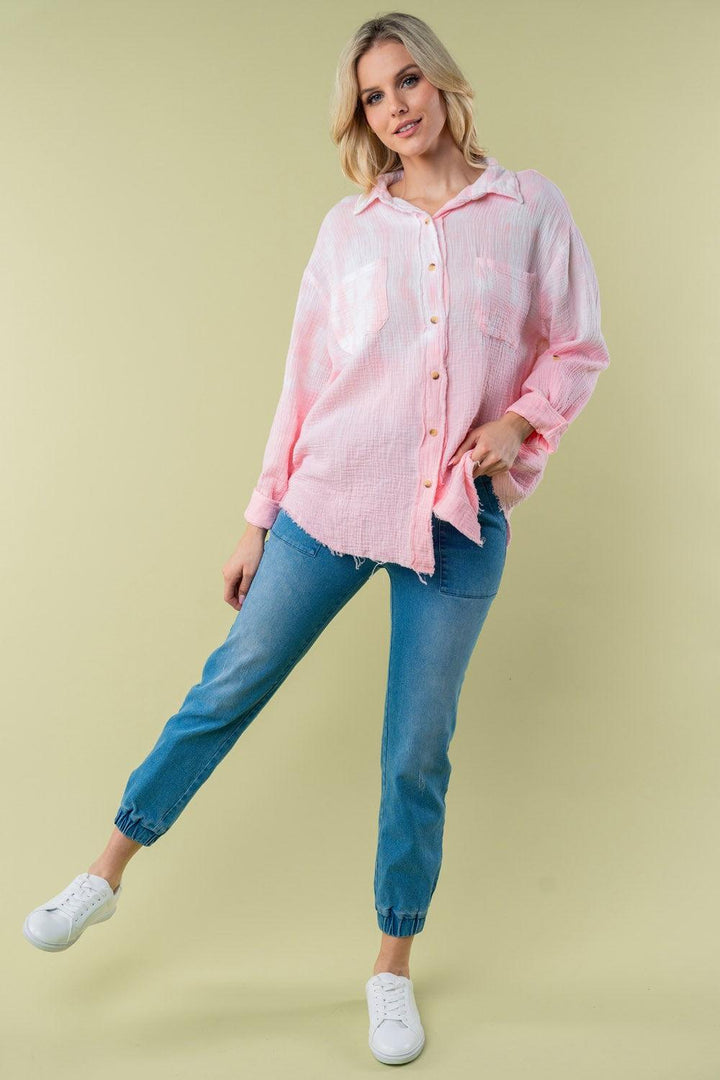 Add a pop of color to your wardrobe with this long sleeve tie-dye Shirt. This shirt features a collared button-down front, button tab sleeves, and a loose fit for a stylish yet comfortable look. Made from lightweight woven material, this shirt is perfect for adding a playful touch to your outfit. Whether you're dressing it up for a night out or keeping it casual for a day of errands, this versatile piece is sure to become a favorite in your closet. Stay on-trend and make a statement with the vibrant tie-dye pattern of this stylish woven shirt. Features: Exposed seam, Pocketed, Raw Hem Sheer: Opaque Stretch: No stretch Material composition: 100% cotton Care instructions: Machine wash cold. Tumble dry low. Imported Product measurements: S: bust 50 in, length 31 in, shoulder 31 in, sleeve 18.5 in M: bust 52 in, length 31 in, shoulder 31 in, sleeve 18.5 in L: bust 54 in, length 32 in, shoulder 32 in, sleeve 18.5 in XL: bust 56 in, length 33 in, shoulder 33 in, sleeve 18.5 in 1XL: bust 58 in, length 33 in, shoulder 33 in, sleeve 18.5 in 2XL: bust 60 in, length 34 in, shoulder 34 in, sleeve 18.5 in 3XL: bust 62 in, length 34 in, shoulder 34 in, sleeve 18.5 in