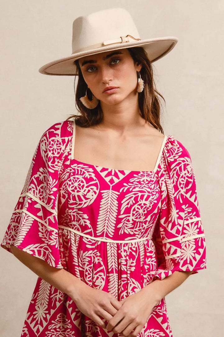 This stunning bohemian-inspired dress features a flattering square neckline and romantic three-quarter bell sleeves. Crafted from lightweight flowing fabric with an eye-catching pink and white paisley print throughout. The elastic waistband creates a flattering silhouette while the tiered ruffle hem adds playful movement. Perfect for summer occasions, vacation wear, or casual day outings. The vibrant paisley pattern and relaxed fit make this dress a versatile wardrobe staple that combines comfort with effortless style. Features:Smocked,Tied Stretch:Slightly stretchy Body:Not lined Material composition:100%RAYON Care instructions:Machine wash cold. Tumble dry low. Imported Product Measurements (Measurements by inches) & Size Conversion Size Bust Waist Hip S 33-35 25-27 35-37 M 35-38 27-30 37-40 L 38-40 30-32 40-42 XL 40-42 32-34 42-44