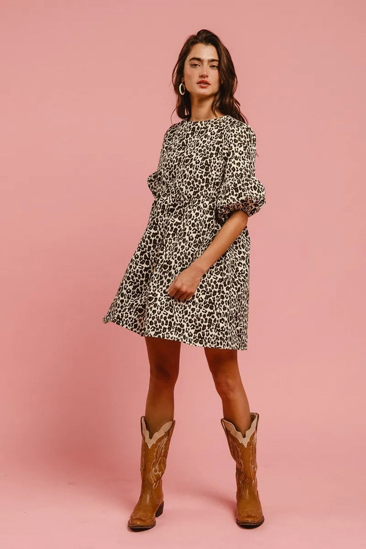 BiBi Leopard Denim Dress With Back Contrast Tie Detail