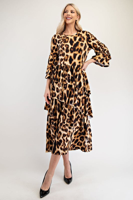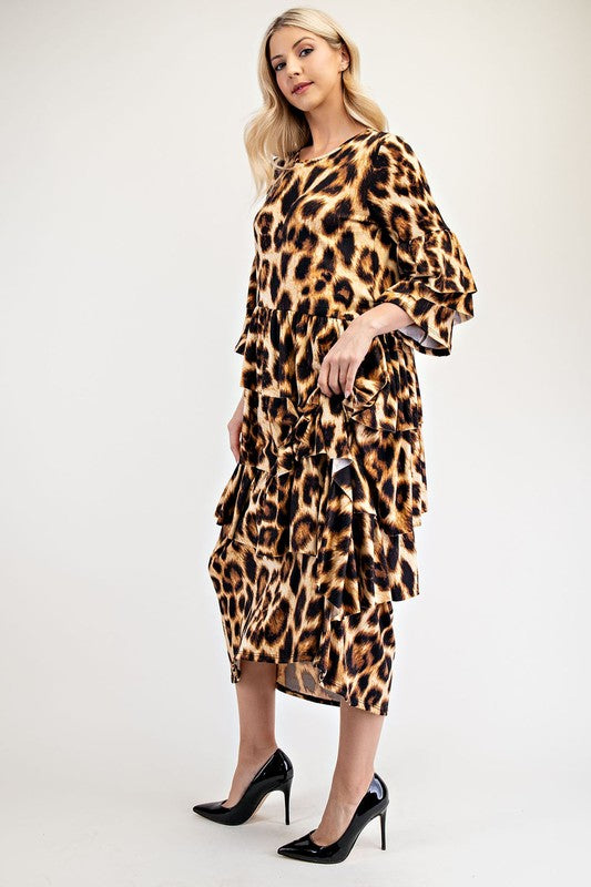 Celeste Full Size Leopard Asymmetrical Ruffle Midi Dress Plus Size