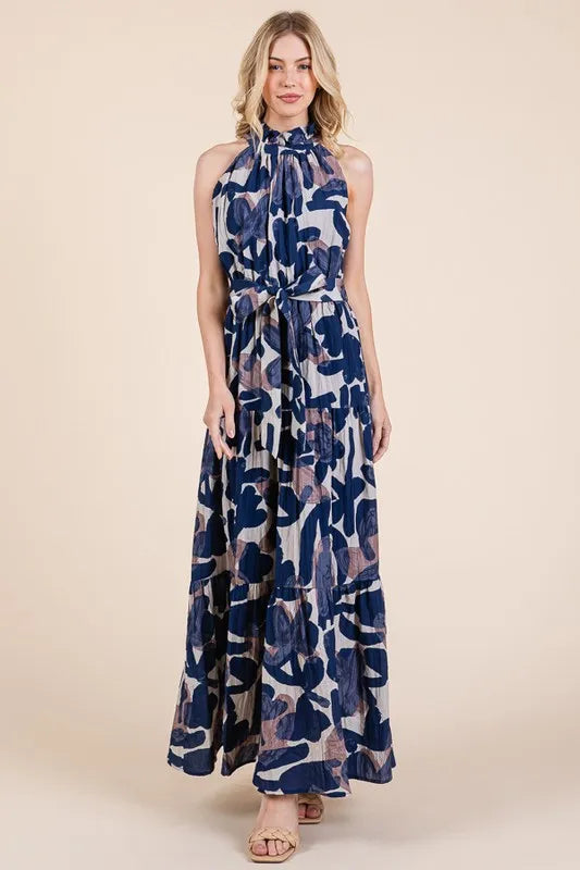 Make a statement in this abstract halter neck tie-waist tiered maxi dress. The abstract print adds a modern and artistic flair to the dress. The halter neck design is elegant and perfect for showcasing your shoulders. The tie-waist detail defines the waist for a flattering silhouette. Elevate your outfit with this striking and stylish maxi dress. Features: Tiered, Drawstring, Ruffled Stretch: No stretch Body: Lined Material composition: Self: 75%VISCOSE, 25%NYLON Lining: 100%RAYON Care instructions: Machine wash cold. Tumble dry low. Imported Product measurements: S:Bust 34-36 in, Waist 26-28 in, HIP 36-38 in M:Bust 37-38 in, Waist 29-31 in, HIP 39-41 in L:Bust 39-40 in, Waist 32-33 in, HIP 42-43 in XL:Bust 41-42 in, Waist 34-35 in, HIP 44-45 in