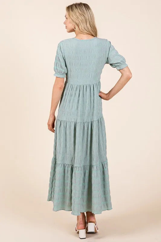 The Textured Short Sleeve Tiered Dress is a stylish and versatile piece for any occasion. Featuring a textured fabric, this dress offers a unique and trendy look. With its tiered design and short sleeves, it combines fashion and comfort effortlessly. Features: Tiered, Smocked Stretch: Slightly stretchy Body: Not lined Material composition: 95% Polyester 5% Spandex Care instructions: Machine wash cold. Tumble dry low. Imported Product measurements: S:Bust 35-36 in, Waist 27-28 in, HIP 36-37 in M:Bust 37-38 in, Waist 29-30 in, HIP 38-39 in L:Bust 39-40 in, Waist 31-32 in, HIP 40-41 in XL:Bust 41-42 in, Waist 33-34 in, HIP 42-43 in
