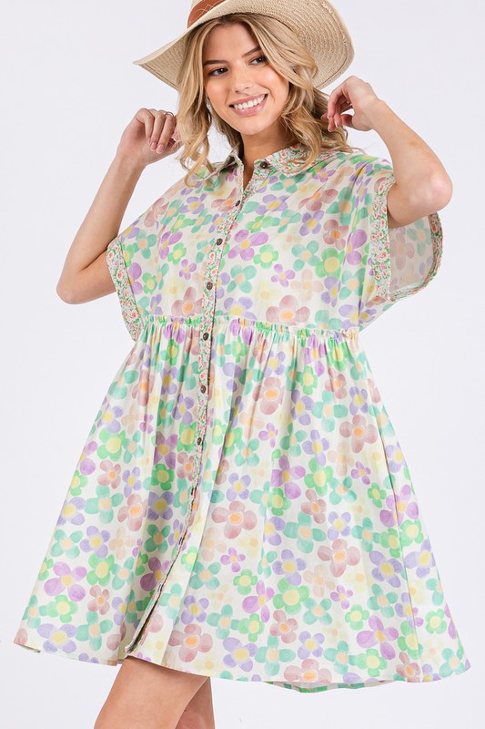 The Floral Babydoll Short Sleeves Dress is a charming and feminine wardrobe piece. With its delicate floral pattern and flattering babydoll silhouette, this dress exudes a sweet and romantic vibe. Perfect for a casual day out or a special occasion, this dress is a versatile choice that will make you feel lovely and stylish. Features: Buttoned, Frill, Pocketed Sheer: Opaque Stretch: No stretch Body: Not lined Material composition: 100% cotton Care instructions: Machine wash cold. Tumble dry low. Imported Product measurements: S:Bust 34-35 in, Waist 26-27 in, HIP 35-36 in M:Bust 36-37 in, Waist 28-29 in, HIP 38-40 in L:Bust 38-39 in, Waist 30-31 in, HIP 42-44 in