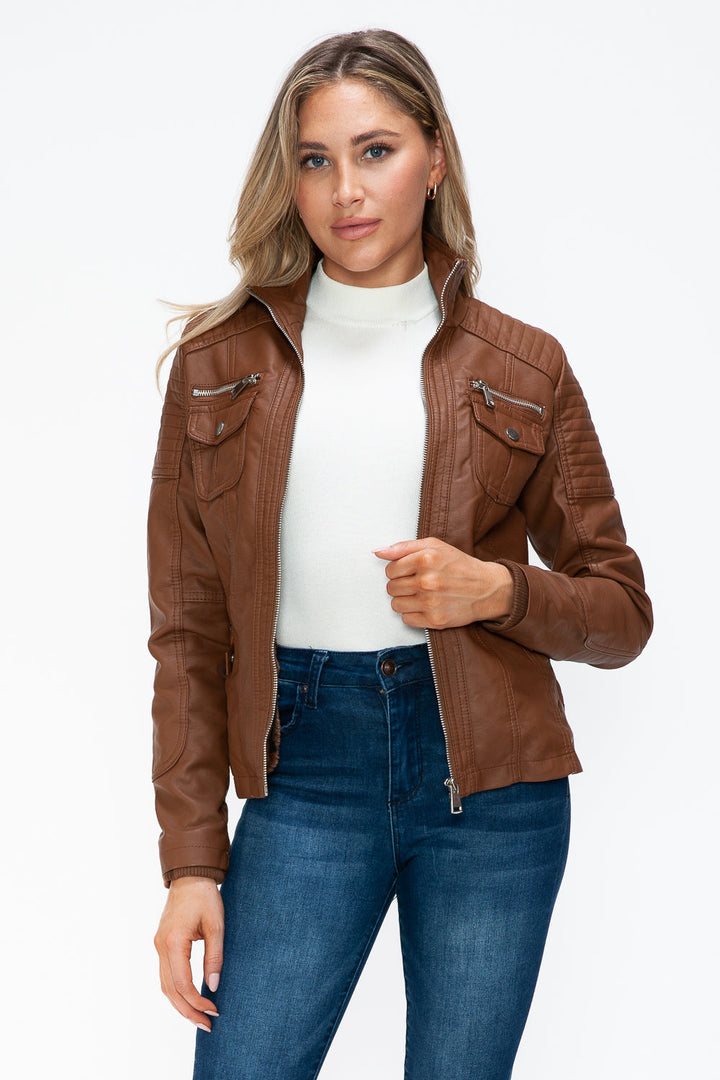 The Removable Faux Layered Multi-Pocket Jacket with Fuzzy Hood combines style and functionality in one versatile piece. Featuring a removable faux layered design, this jacket offers a layered look. The fuzzy hood adds a cozy touch, while the multiple pockets provide convenience for storing essentials. Stay warm, on-trend, and comfortable with this stylish jacket that offers a unique twist to your outerwear collection. Features: Basic style, Pocketed Thickness: Normal Body: Not lined Material composition: 100% pleather Care instructions: Machine wash cold. Tumble dry low. Imported Product measurements: S:Bust 34-36 in, Waist 26-28 in M:Bust 37-38 in, Waist 29-31 in L:Bust 39-40 in, Waist 32-33 in XL:Bust 41-42 in, Waist 34-35 in