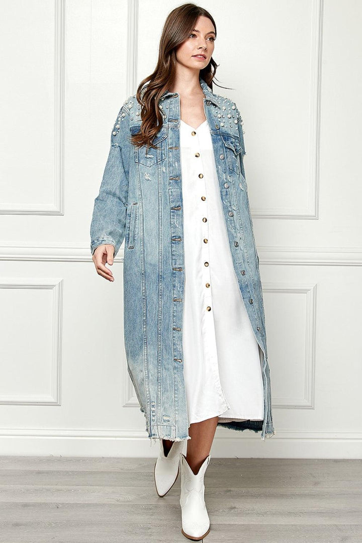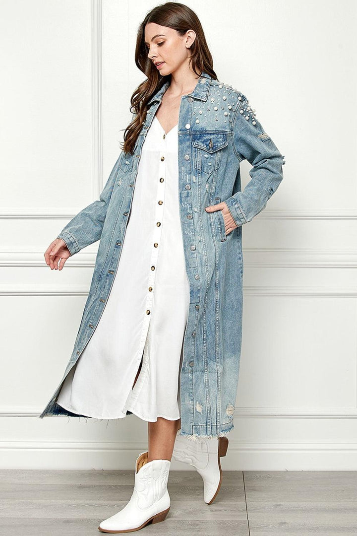 The Distressed Raw Hem Pearl Detail Button Up Jacket is a unique and fashionable addition to your wardrobe. The distressed detailing adds a trendy and edgy vibe to the jacket, while the pearl embellishments bring an element of elegance and femininity. The button-up front allows for versatile styling options and the raw hem adds a modern touch. Pair it with jeans and a t-shirt for a casual yet chic look, or layer it over a dress for a more dressed up ensemble. This jacket is a statement piece that will elevate any outfit. Features: Distressed, Raw hem Stretch: Slightly stretchy Material composition: 90% cotton, 10% polyester Care instructions: Machine wash cold. Tumble dry low. Imported Product measurements: S: bust 36 in M: bust 38 in L: bust 40 in 1XL: bust 42-43 in 2XL: bust 45-46 in 3XL: bust 48-49 in
