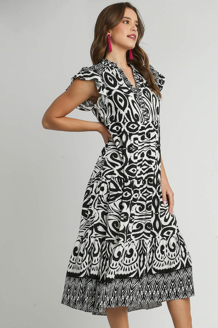 Umgee Full Size Two Tone Border Print Ruffle Cap Sleeve Midi Dress Plus Size