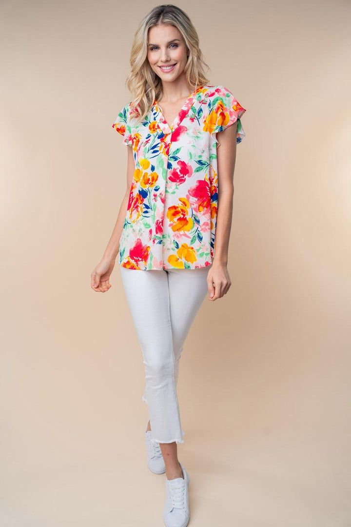 The short sleeve floral woven top is a must-have piece for your wardrobe. This versatile top can be easily dressed up with a blazer and heels for a chic office look, or dressed down with jeans and sneakers for a casual weekend outfit. The floral pattern adds a pop of color and femininity to your ensemble. The short sleeves make it perfect for warmer weather and can be easily layered for cooler days. Embrace the beauty of nature with this lovely floral woven top. Elevate your style with this effortlessly chic piece! Features: Ruffled Sheer: Opaque Stretch: Slightly stretchy Material composition: 95% polyester, 5% spandex Care instructions: Machine wash cold. Tumble dry low. Imported Product measurements: S: bust 30 in, length 25 in, sleeve (with shoulder) 10 in M: bust 32 in, length 25 in, sleeve (with shoulder) 10 in L: bust 34 in, length 26 in, sleeve (with shoulder) 11 in XL: bust 36 in, length 26 in, sleeve (with shoulder) 11 in 1XL: bust 38 in, length 27 in, sleeve (with shoulder) 11.5 in 2XL: bust 40 in, length 27 in, sleeve (with shoulder) 11.5 in 3XL: bust 42 in, length 28 in, sleeve (with shoulder) 12 in