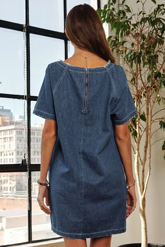 ADORA Raw Hem Mini Denim Dress with Pockets