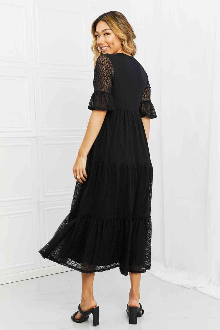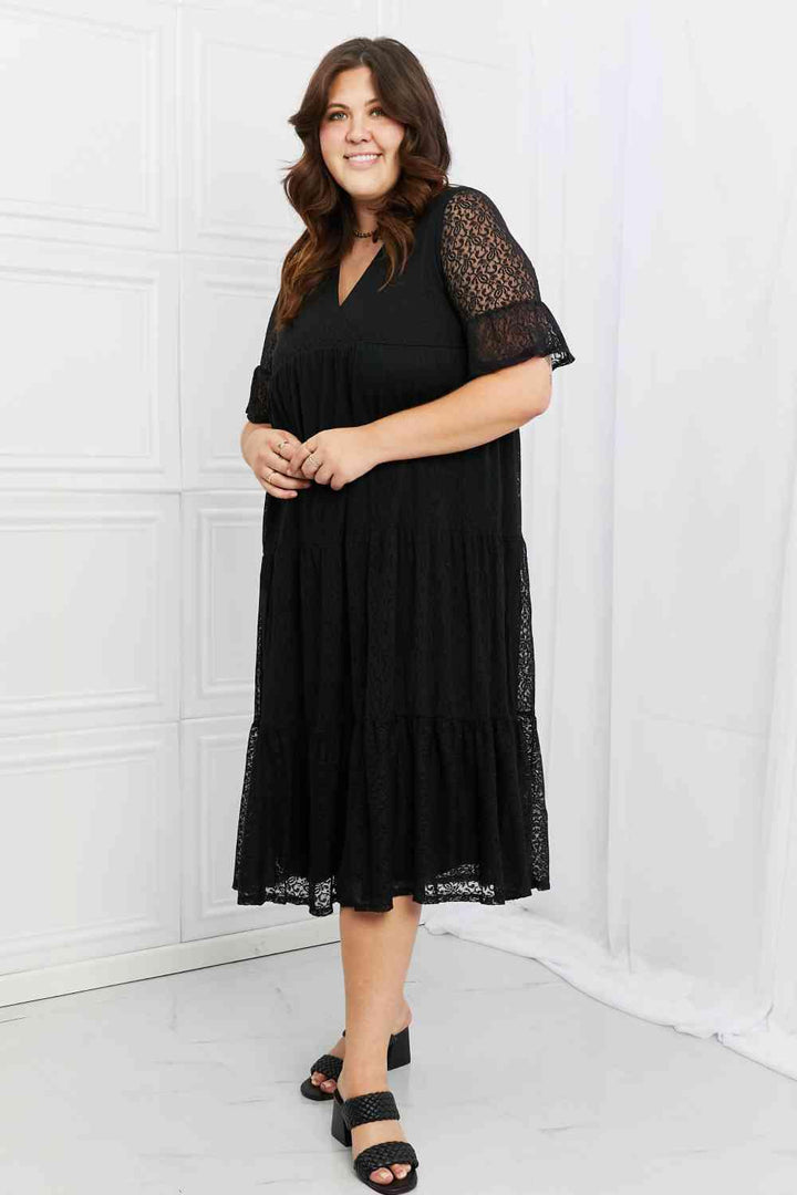 A beautiful lace midi dress that can be worn to many different events and occasions! This dress is fully lined with see through lace, ruffled sleeves. Pair with heels for an elevated look. Pattern type: Solid Style: Casual Features: Lace Neckline: Surplice Length: Midi Sleeve length: Half sleeves Sleeve type: Flounce sleeves Hem shaped: Layered/tiered Sheer: No Body: Lined Material composition: 95% polyester, 5% spandex Stretch: Moderate stretch Care instructions: Machine wash cold. Tumble dry low. Made in USA Models are wearing sizes S and 1XL. Product measurements: S: bust 31 in, length 46.5 in M: bust 33 in, length 47 in L: bust 35 in, length 47.5 in 1XL: bust 37 in, length 48 in 2XL: bust 38 in, length 48.5 in 3XL: bust 39 in, length 49.5 in P & Rose has been inspiring confidence in girls through their colorful and unique designs since their beginning in 1991. They are a fashion symbol in their home in Los Angeles. Young women sport confidence, individuality, and courage when they wear P & Rose.
