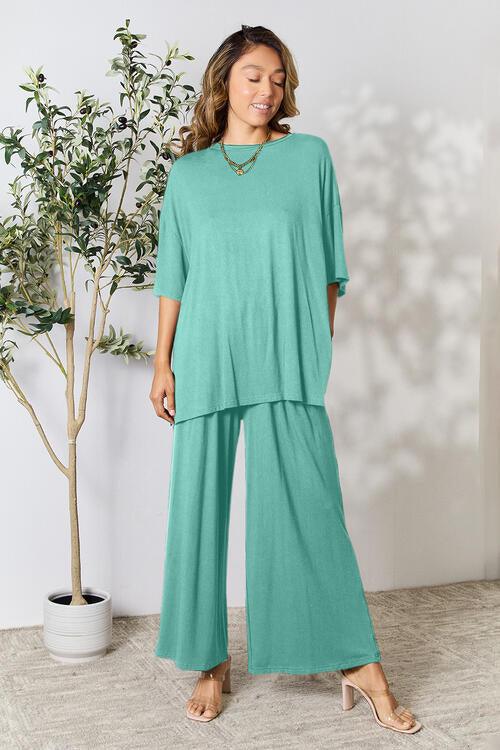Double Take Full Size Round Neck Slit Top and Pants Set