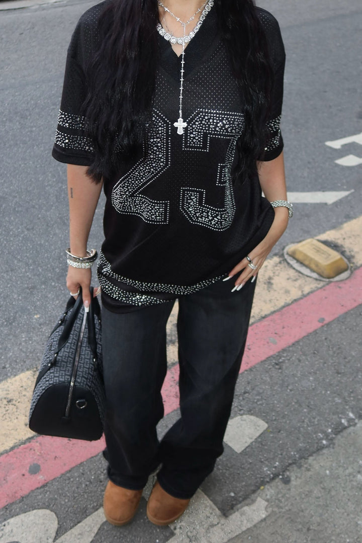 Available In Black And Burgundy. | V-Neck | Short Sleeve | Front Screen | Rhinestones | Stretch | Tunic Length | 100% Polyester | Imported