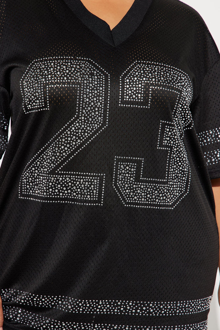 Available In Black And Burgundy. | V-Neck | Short Sleeve | Front Screen | Rhinestones | Stretch | Tunic Length | 100% Polyester | Imported