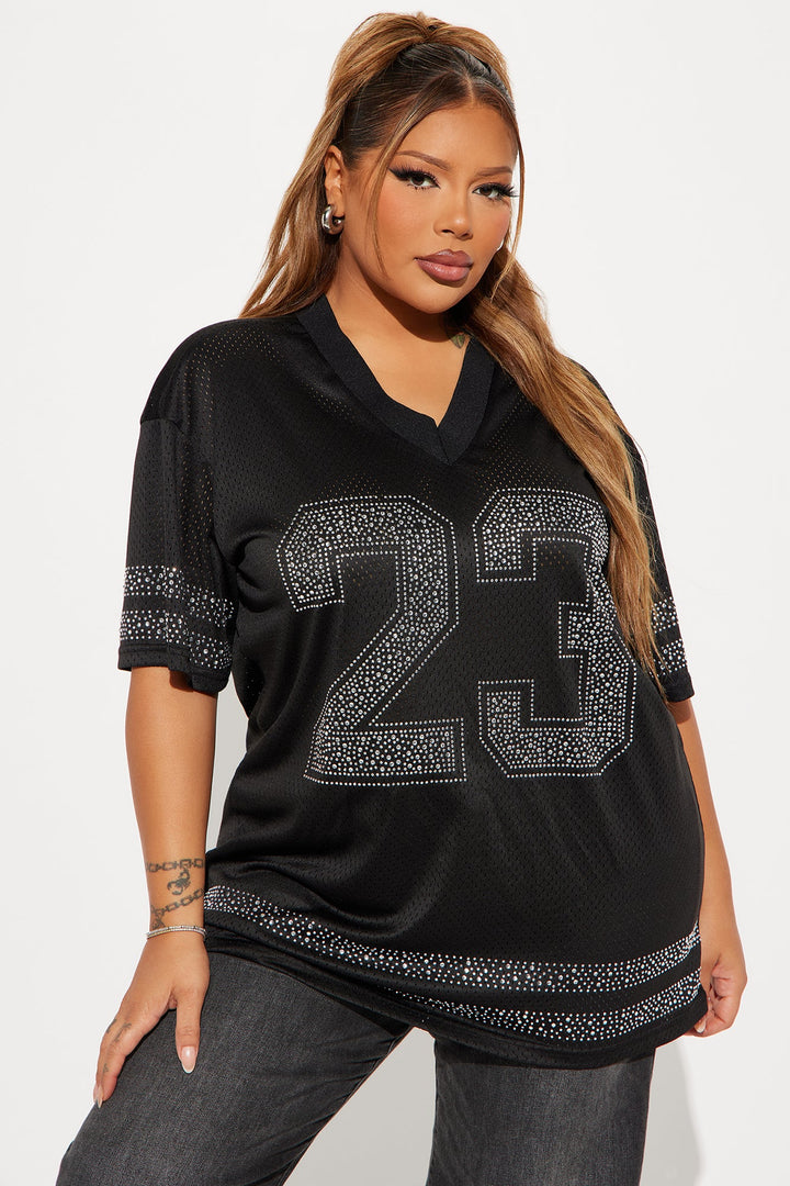 Available In Black And Burgundy. | V-Neck | Short Sleeve | Front Screen | Rhinestones | Stretch | Tunic Length | 100% Polyester | Imported