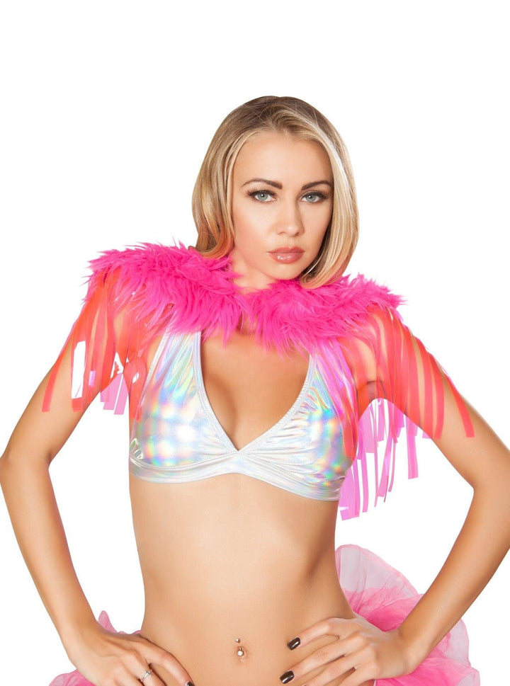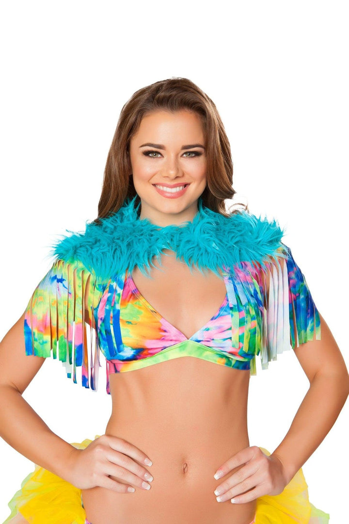 Fringed Shrug with Fur Detail Fabric: Nylon/Spandex Origin: Made in the USA Also Shown and Sold Separately... T3253 - Halter Top