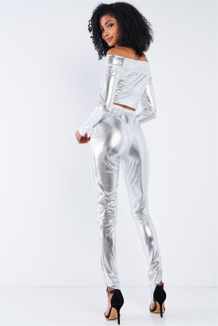 Metallic Small Scales Print Long Sleeve Off-the-shoulder Cropped Top And High Waist Slim Fit Legging Set