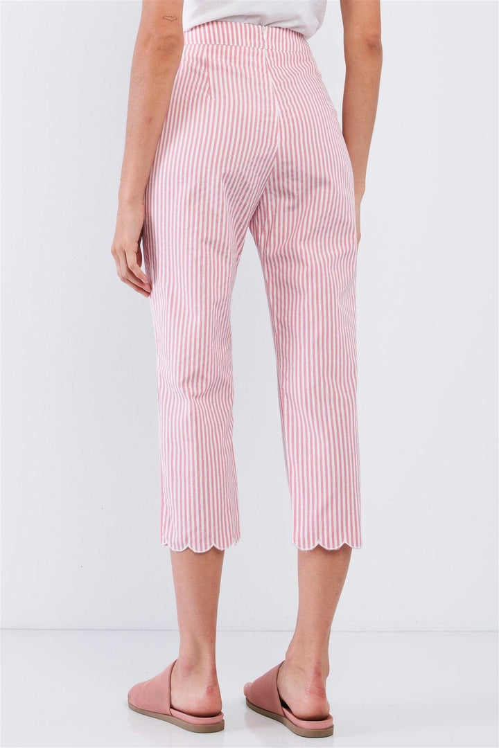 Red & White Striped High Waist Scalloped Hem Summer Capri Pants