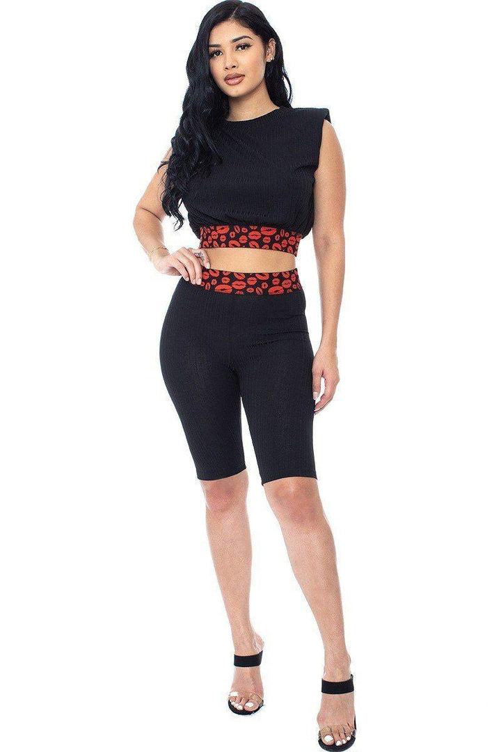 Imported S.M.L COLOR CONTRAST LACE UP SIDE SHORTS SET & ROUND NECK SLEEVELESS CROP TOP COLOR BLOCK 95% Cotton 5% Spandex Black/Red SYM Shoulder Pad And Leopard Detailed Biker Shorts