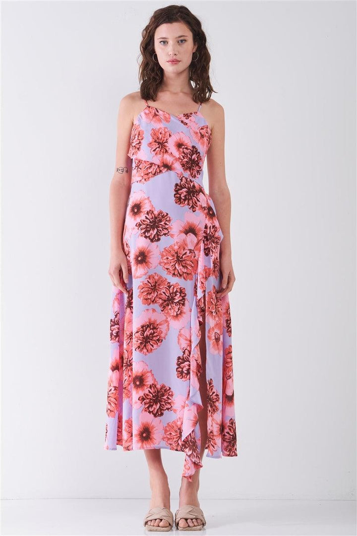 Floral Print Sleeveless Self-tie Wide Wrap Front Ruffle Hem Side Slit Detail Midi Dress