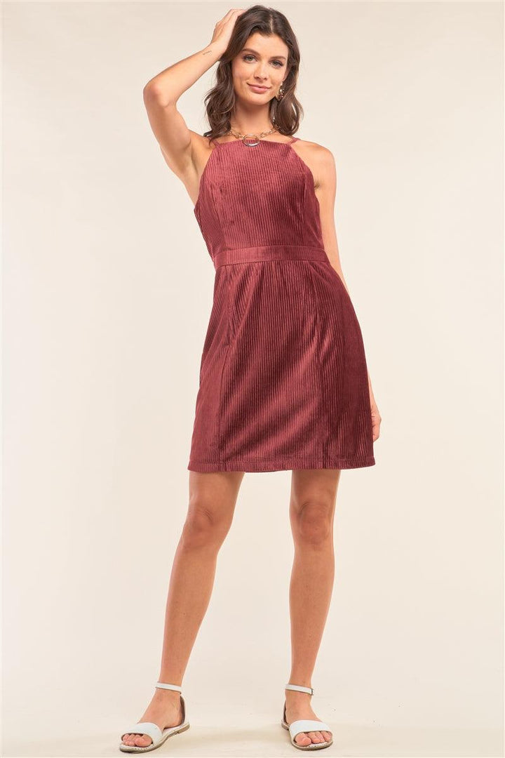 Cranberry Red Corduroy Sleeveless Square Neck Tight Fit Mini Dress