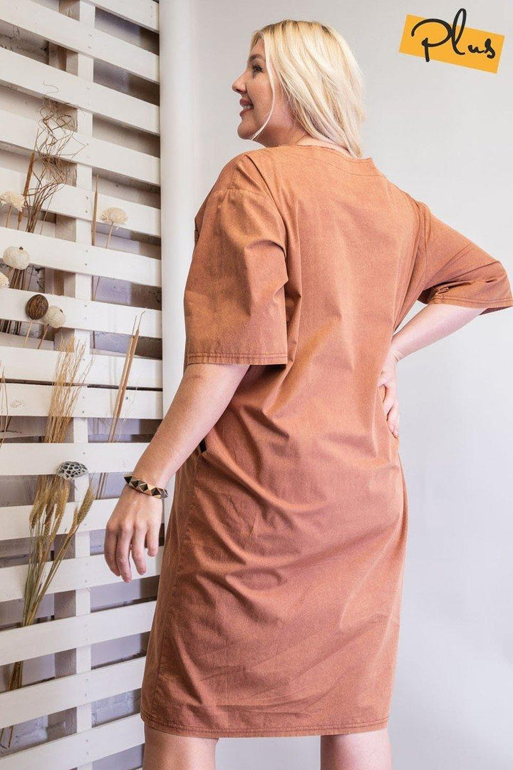 Introducing our Mineral Washed Loose Fit Dress, an effortlessly chic addition to your wardrobe. Crafted with attention to detail, this knee-length dress seamlessly combines a relaxed silhouette with chest and side pockets for a laid-back and stylish look. Key Features: 1. Sizes: Available in 1XL, 2XL, and 3XL to ensure a perfect fit for various body shapes. 2. Color: Faded Rust, a warm and earthy hue that adds a touch of rustic charm. 3. Material: Made from 95% Polyester and 5% Spandex for a comfortable and stretchy feel. 4. Design Elements: Effortless pull-on style, chest patch pocket, side hip pocket, shapeless and slouchy silhouette, and a boxy, oversized fit for a casual and laid-back dress. Product Details: • Effortless All-Day Wear: Our Mineral Washed Loose Fit Dress is designed for maximum comfort, allowing you to stay stylish and relaxed throughout the day. • Quality Craftsmanship: Each dress is carefully crafted with attention to detail, ensuring a high standard of quality. • Care Instructions: Maintain the pristine condition of your dress with proper washing and care. Why Choose Mineral Washed Loose Fit Dress? Experience the perfect blend of comfort and style with our chic and versatile loose fit dress. The faded rust color and oversized fit make it a standout piece for any casual occasion. Ideal Occasions: Perfect for casual outings, weekend wear, or any event where you want to showcase a laid-back yet stylish look. Customer Reviews: - "Effortless and comfortable! The oversized fit is perfect for a relaxed day." - Emily G. - "Faded Rust is a gorgeous color. The chest and hip pockets add a nice touch!" - Alex K. - "Versatile and stylish—a must-have for a casual and trendy wardrobe!" - Jessica L. Size Guide: For accurate sizing guidance, please review our size chart available on the website. Shipping and Returns: • Fast Shipping: We offer speedy delivery to your doorstep. • Hassle-Free Returns: If you're not completely satisfied, our flexible return policy ensures your peace of mind. Elevate your style with our Mineral Washed Loose Fit Dress in Faded Rust. Add it to your cart now and experience the perfect blend of fashion and comfort! Mineral Washed Loose Fit Dress