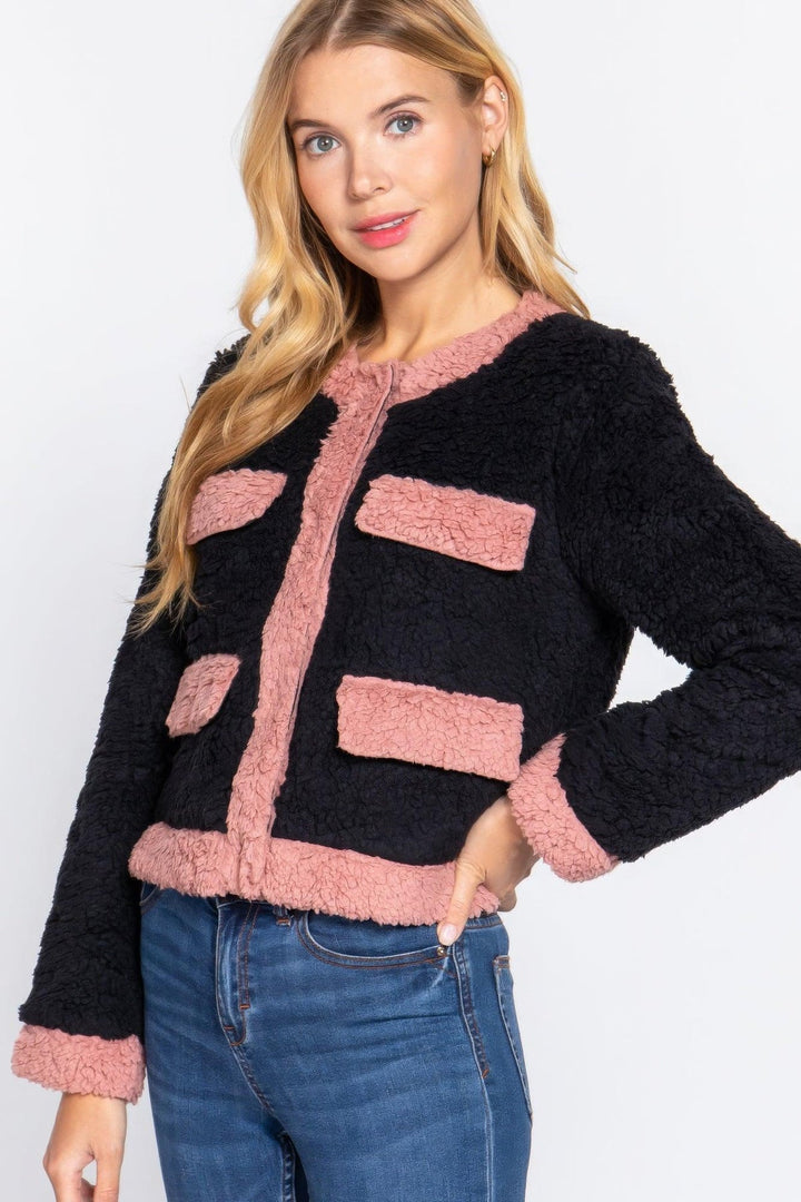 Long Sleeve Pocket Detail Faux Fur Jacket