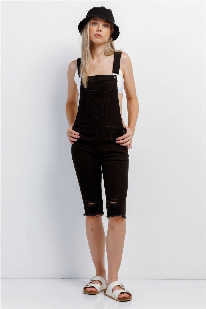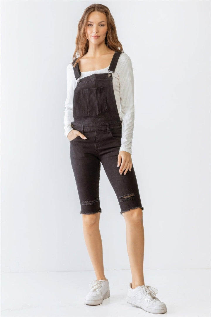 Black Denim Distressed Detail Raw Hem Cropped Bermuda Overall