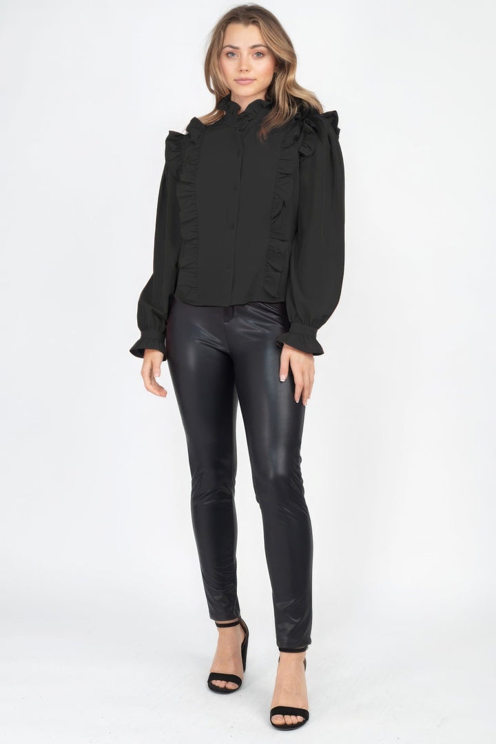 Elevate your wardrobe with our Mock Neck Ruffled Buttoned Top in sleek Black, a sophisticated and versatile piece that seamlessly blends style and comfort. Meticulously crafted with attention to detail, this woven ruffle trim top is designed to make a statement with its mock neckline, long cuffed sleeves, front button-down closure, and waist-length silhouette. Key Features: 1. Material: Crafted from a blend of 95% Polyester and 5% Spandex, this top ensures both comfort and durability for all-day wear. 2. Design: The woven ruffle trim adds a touch of elegance, while the mock neckline and front button-down closure offer a chic and polished look. 3. Color: Available in timeless Black, allowing for versatile styling and effortless pairing with various bottoms and accessories. 4. Fit: The waist-length silhouette provides a flattering and stylish fit, making it a perfect addition to your wardrobe. Product Details: - Comfortable All-Day Wear: Tailored for maximum comfort, our Mock Neck Ruffled Buttoned Top is perfect for all-day wear, keeping you stylish and at ease. - Quality Craftsmanship: Each detail, from the ruffle trim to the button-down closure, is meticulously crafted to meet the highest standards of quality. - Versatile Styling: Whether paired with jeans for a casual look or dressed up with a skirt for a more formal occasion, this top offers endless styling possibilities. Why Choose Mock Neck Ruffled Buttoned Top? This top stands out with its unique blend of sophistication and contemporary design. The mock neckline and ruffle trim add a touch of femininity, while the buttoned front provides a classic and polished finish. Ideal Occasions: Perfect for a variety of occasions, from casual outings to office wear or a night out, the Mock Neck Ruffled Buttoned Top effortlessly transitions from day to night. Customer Reviews: - "I love my Black Mock Neck Top! The ruffle trim gives it that extra flair. So chic!" - A. M. - "This top is a wardrobe essential. The fit is amazing, and it's so easy to style for different occasions." - K. S. Size Guide: For accurate sizing guidance, please review our size chart available on the website. Shipping and Returns: - Fast Shipping: We offer speedy delivery to your doorstep. - Hassle-Free Returns: If you're not completely satisfied, our flexible return policy ensures your peace of mind. Get ready to turn heads and make a statement with our Mock Neck Ruffled Buttoned Top in Black. Add it to your cart now for the perfect blend of fashion and comfort! Feel free to adapt and expand on this template to suit the specific product you're describing and the style of your fashion website. Tailor it to the unique selling points of the top and the preferences of your target audience. Mock Neck Ruffled Buttoned Top