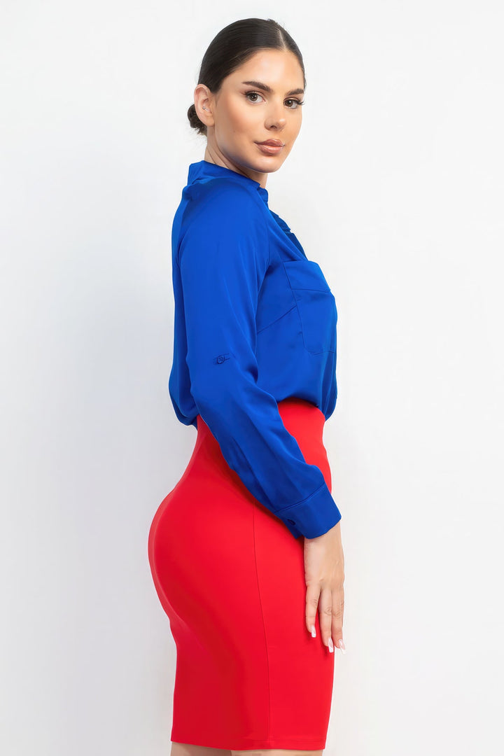 Introducing our Button-down Pocketed Collared Top in the regal Royal hue—a woven double-pocketed fashion piece that seamlessly combines trendiness with comfort. This solid-colored top features a collared neckline, front button-down closure, long cuffed sleeves, and a waist length for a chic and versatile look. Key Features: - Material: Crafted from 100% Polyester for a lightweight and comfortable wear. - Color: Choose the regal Royal shade for a bold and sophisticated statement. Product Details: - Collared Chic: The Button-down Pocketed Collared Top features a stylish collared neckline, adding a touch of sophistication to your ensemble. - Functional Pockets: Double pockets on the front provide both style and convenience, making this top a practical and trendy choice. - Button-Down Closure: The front button-down closure adds a classic and polished element to the overall design. - Waist Length: Designed with a waist-length silhouette for a modern and flattering fit. Why Choose the Button-down Pocketed Collared Top? Elevate your fashion game with this trendy and versatile top that seamlessly blends comfort and style, making it a statement piece for any occasion. Ideal Occasions: Perfect for both casual outings and more dressy occasions, this top is a must-have for those who appreciate contemporary fashion. Customer Reviews: 1. "Love the collared neckline—it adds a touch of sophistication! - A. M." 2. "Functional pockets make this top both stylish and practical! - L. S." 3. "The button-down closure adds a classic touch to the trendy design! - R. K." Size Guide: Refer to our size chart on the website for accurate sizing guidance. Shipping and Returns: - Fast Shipping: Experience prompt delivery to your doorstep. - Hassle-Free Returns: Enjoy peace of mind with our flexible return policy. Make a bold fashion statement with the Button-down Pocketed Collared Top in Royal. Embrace the trendiness and versatility of this top, perfect for enhancing your wardrobe with contemporary flair. Button-down Pocketed Collared Top