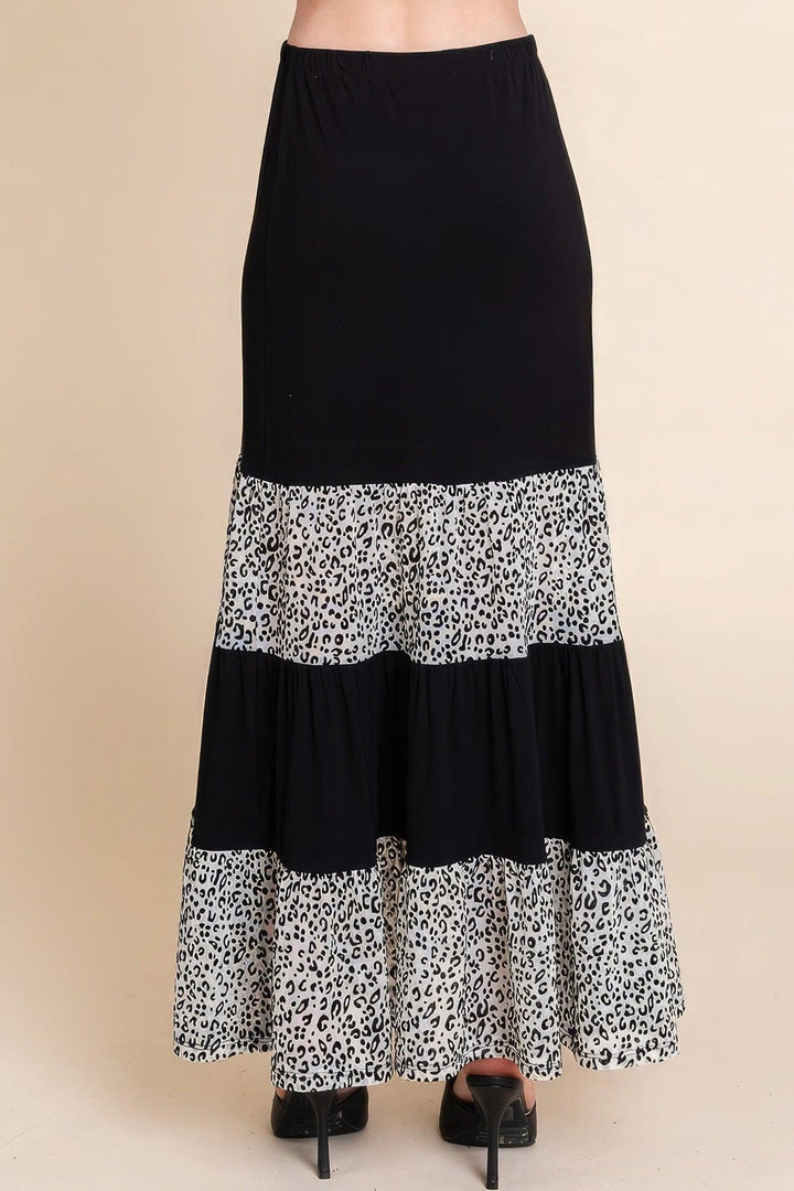 Long Tiered Contrast Fashion Skirt With Velvet Animal Print Mesh