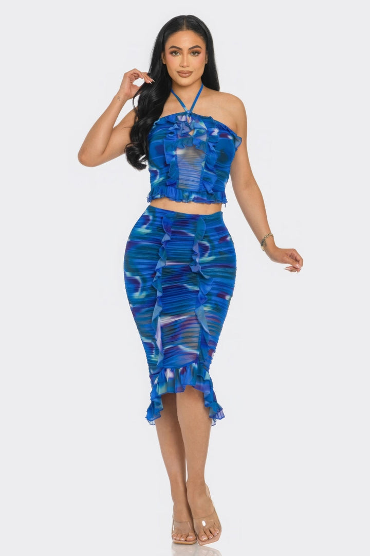Tropical Waters Print Mesh Ruffle Halter Skirt Set