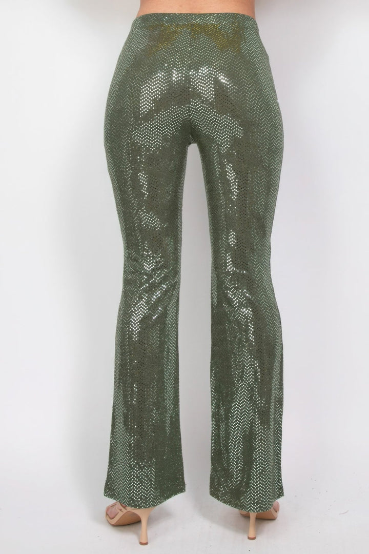 These sequined pants add a touch of glam to your formal wear. The mid-rise elastic waistband and flared leg create a comfortable and flattering fit, while the full length adds a touch of sophistication. Key Features: - Fabric: 88% polyester, 6% metallic, 6% spandex for a comfortable stretch and glamorous finish. - Fit: Mid-rise with an elastic waistband and flared leg for a flattering silhouette. - Color Options: Available in olive. - Sizes: Available in S, M, L. - Design: Features dazzling sequins for a glamorous look. - Versatile Styling: Ideal for formal occasions, easily paired with a stylish top or blouse. Product Details: - Comfortable All-Day Wear: Designed for maximum comfort, from morning to night. - Quality Craftsmanship: Expertly crafted and quality-checked. - Care Instructions: Hand wash cold, lay flat to dry, avoid harsh chemicals. Why Choose Sequined Fit & Flare Midrise Pants These pants offer a blend of glamour and comfort, with a flattering fit and dazzling sequins that are perfect for formal events. Ideal Occasions: Perfect for formal events and special occasions, adding a glamorous touch to your outfit. Customer Reviews: "I absolutely love these pants! They're so comfortable and add just the right amount of sparkle." - Maria S. "These are my go-to pants for formal events. They fit perfectly and look so stylish." - Jessica T. "The quality is outstanding, and I've received so many compliments every time I wear them." - Emily R. Size Guide: For accurate sizing guidance, please review our size chart available on the website. Shipping and Returns: Fast Shipping: We offer speedy delivery to your doorstep. Hassle-Free Returns: If you're not completely satisfied, our flexible return policy ensures peace of mind. Add a touch of glam to your wardrobe with our Sequined Fit & Flare Midrise Pants. Experience the perfect blend of fashion and comfort—add them to your cart now! Sequined Fit & Flare Midrise Pants