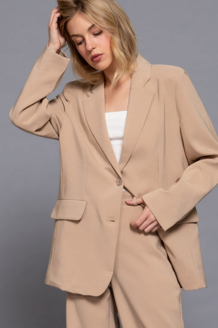 Introduce sophistication and style to your wardrobe with our Long Sleeve Notched Collar Blazer in Taupe. This chic blazer features a classic notched collar and front button closure, offering a polished look perfect for professional settings or smart-casual occasions. The taupe color adds a neutral yet elegant tone, making it easy to pair with a variety of outfits. Crafted from a blend of 90% polyester and 10% spandex, the fabric provides just the right amount of stretch for comfort and flexibility, ensuring a sleek, tailored fit that moves with you. Key Features: Fabric: 90% Polyester, 10% Spandex - A durable fabric blend with a slight stretch, offering a structured fit that remains comfortable throughout the day. Fit: Tailored - Designed to provide a flattering silhouette while allowing ease of movement, perfect for all-day wear. Color Options: Taupe - A versatile and neutral shade that complements both light and dark tones, ideal for mixing and matching with your wardrobe. Sizes: S, M, L - Available in multiple sizes to ensure a comfortable and tailored fit for various body types. Design: Notched collar with front button closure for a classic, refined appearance that adds sophistication to any look. Versatile Styling: Perfect for pairing with office attire, business casual outfits, or even denim for a more relaxed yet refined style. Product Details: Comfortable All-Day Wear: The polyester and spandex blend offers a flexible and comfortable fit, making this blazer ideal for long hours at work or evening events. Quality Craftsmanship: Thoughtfully designed and expertly crafted, this blazer is built to last and will become a go-to staple in your wardrobe. Why Choose Long Sleeve Notched Collar Blazer in Taupe The taupe color brings a fresh, modern touch to a timeless design, making this blazer a versatile addition to your collection. The spandex blend ensures a flattering and comfortable fit, while the structured tailoring keeps you looking sharp and professional. Whether you're at the office or enjoying a day out, this blazer will keep you stylish and confident. Ideal Occasions: Perfect for office wear, business meetings, interviews, or casual outings where you want to look put-together and sophisticated. Customer Reviews: "I love this taupe blazer! It's so versatile and can be dressed up or down. The fit is perfect, and the fabric is so comfortable." - Emily L. "This blazer is the perfect neutral piece for my wardrobe. It goes with everything and is perfect for the office." - Sarah W. "The taupe color is beautiful, and the fit is so flattering. It’s my go-to blazer for both work and casual events." - Olivia M. Size Guide: For accurate sizing guidance, please refer to our size chart available on the website. Shipping and Returns: Fast Shipping: We offer quick delivery to your doorstep. Hassle-Free Returns: If you're not completely satisfied, our flexible return policy ensures your peace of mind. Add the Long Sleeve Notched Collar Blazer in Taupe to your cart today and experience a blend of classic style, comfort, and versatility for any occasion! Long slv front button closure blazer