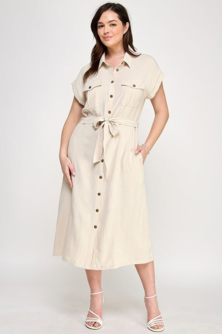Add a touch of chic sophistication to your wardrobe with our Front Tied Buttoned Short Sleeve Dress in Beige. This dress combines effortless style with a flattering fit, featuring a front tie and button-down details that elevate its design. Made from 100% Polyester, it offers a comfortable, breathable fit, perfect for both casual and semi-formal occasions. The short sleeves add a relaxed vibe, while the beige color makes it versatile and easy to pair with various accessories. Key Features: Fabric: 100% Polyester, providing a soft and lightweight feel that's perfect for all-day wear Fit: Front tie and button-down design, creating a flattering and adjustable fit Color Options: Beige Sizes: Available in 1XL, 2XL, and 3XL Design: Features a stylish front tie, button details, and short sleeves for a casual yet sophisticated look Versatile Styling: Pair with sandals for a laid-back day look or elevate it with heels for a more formal touch Product Details: Comfortable All-Day Wear: The lightweight polyester fabric ensures breathability and comfort, ideal for warm weather or long events Quality Craftsmanship: The button-down front and front tie details are carefully designed for a polished, flattering finish Why Choose Front Tied Buttoned Short Sleeve Dress This dress offers an easy blend of style and comfort with its simple yet sophisticated design. The front tie and button-down details give it a tailored look, while the beige color adds a timeless and versatile touch to your wardrobe. Ideal Occasions: Perfect for casual outings, lunch dates, office wear, or any occasion where you want to feel stylish and comfortable. Customer Reviews: "The front tie gives this dress a flattering fit, and I love how breathable the fabric is!" Jamie S. "This is my go-to dress for casual days out! It's so comfortable, and the beige color is perfect for pairing with any accessories." Tamara W. "I love how versatile this dress is. It can easily be dressed up or down, and it fits beautifully." Olivia G. Size Guide: For accurate sizing guidance, please review our size chart available on the website. Shipping and Returns: Fast Shipping: We offer speedy delivery to your doorstep. Hassle-Free Returns: If you're not completely satisfied, our flexible return policy ensures your peace of mind. Add the Front Tied Buttoned Short Sleeve Dress in Beige to your wardrobe today and enjoy the perfect combination of style, comfort, and versatility! Front Tied Buttoned Short Sleeve Dress