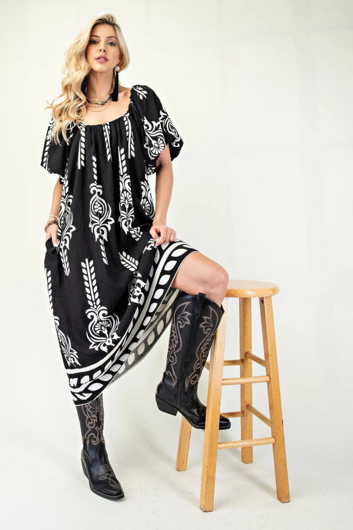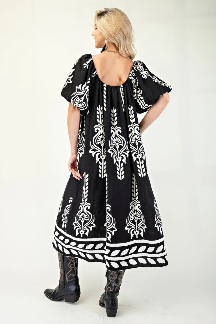 Product Description: Feminine and effortlessly stylish, this printed midi dress brings charm and ease to any occasion. Featuring short puff sleeves and a flattering midi length, it offers a balanced silhouette with soft structure and movement. The vibrant print adds a lively touch, while the lightweight polyester fabric ensures breathable comfort throughout the day. Whether styled with sandals for daytime or heels for an evening look, this dress is a versatile staple you’ll reach for again and again. Product Details: 100% Polyester Allover print for a bold, eye-catching look Short puff sleeves for a soft, feminine finish Midi length offers elegant coverage Lightweight and breathable fabric Ideal for daytime events, brunch, or casual gatherings Size Guide: For accurate sizing guidance, please review our size chart available on the website. Shipping and Returns: Fast Shipping: We offer speedy delivery to your doorstep. Hassle-Free Returns: If you're not completely satisfied, our flexible return policy ensures your peace of mind. Printed Midi Dress With Short Puff Sleeves