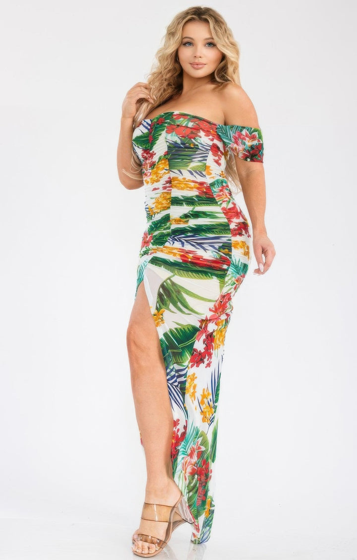 Product Description: Step into summer with confidence in this plus-size tropical off-shoulder maxi dress, designed to flatter and flow. Crafted from lightweight printed mesh, it features a breezy silhouette with full lining for added comfort and coverage. The off-shoulder neckline and draped sleeves create a soft, feminine shape, while shirred detailing enhances the waist for a flattering fit. A thigh-high slit adds just the right amount of allure, making it perfect for beach getaways or sunset dinners. With its stretch fabric and vibrant print, this dress brings effortless elegance to warm-weather occasions. Product Details: Lightweight printed mesh with full lining for coverage Off-shoulder neckline and draped sleeves for a romantic look Shirred detail at the bodice for a flattering shape Side slit for movement and style Stretch fabric for a comfortable fit (95% Polyester, 5% Spandex) Perfect for vacations, summer parties, and outdoor events Size Guide: For accurate sizing guidance, please review our size chart available on the website. Shipping and Returns: Fast Shipping: We offer speedy delivery to your doorstep. Hassle-Free Returns: If you're not completely satisfied, our flexible return policy ensures your peace of mind. Plus Tropical Off Shoulder Draped Slv Maxi Dress