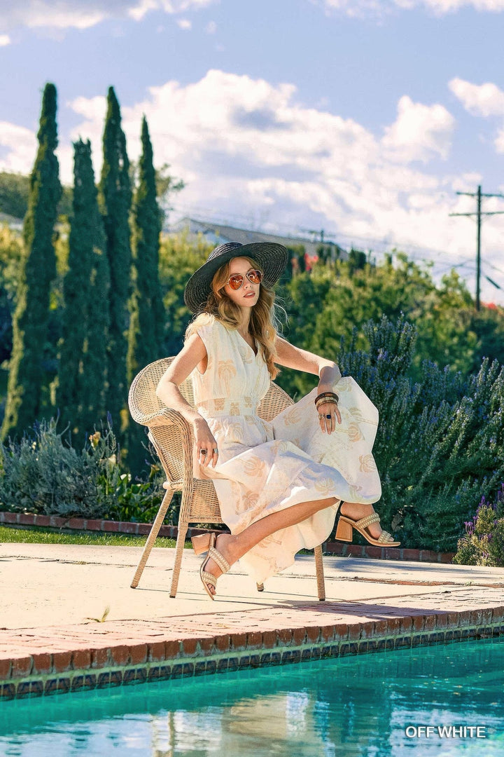 Product Description: Breezy and beautiful, the Tropical Breeze Embroidered Midi Dress is your go-to piece for warm, sunny days. Featuring a vibrant tropical blue palm print, this dress is crafted from 100% cotton for a lightweight and breathable feel. The relaxed midi length offers an easy silhouette, while the smocked waist defines the shape without sacrificing comfort. A collared V-neckline and cap sleeves add a polished finish, making it effortlessly wearable from daytime outings to vacation evenings. Unlined for an airy, natural drape, it's a summer essential with a touch of charm. Product Details: Tropical blue palm print with delicate embroidered detail Relaxed midi length for comfortable, breezy wear Smocked waist enhances shape while staying easy to wear Collared V-neckline adds structure and style Cap sleeves for light coverage with a feminine touch 100% cotton fabric; not lined for a breathable, natural feel Size Guide: For accurate sizing guidance, please review our size chart available on the website. Shipping and Returns: Fast Shipping: We offer speedy delivery to your doorstep. Hassle-Free Returns: If you're not completely satisfied, our flexible return policy ensures your peace of mind. Tropical Breeze Embroidered Midi Dress