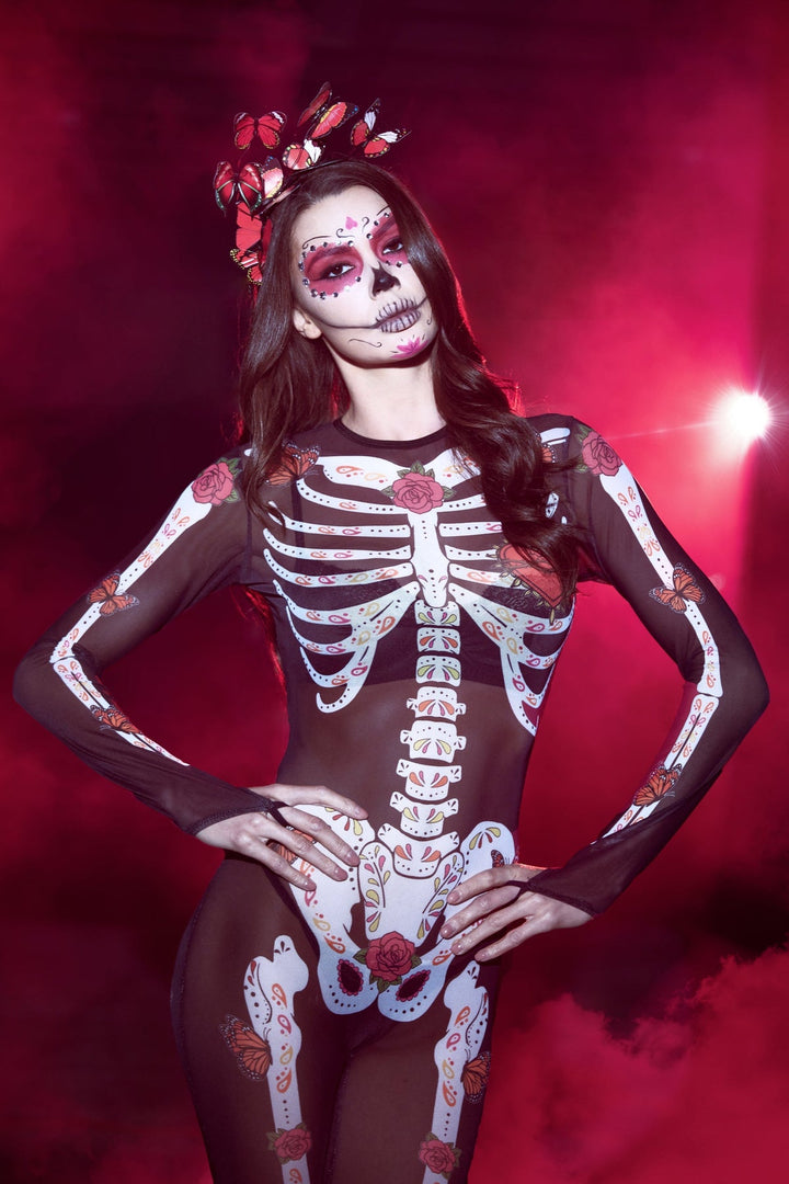 Includes Sheer Screen Printed Design Bodysuit and Headpiece *Bra and Panty Not Included