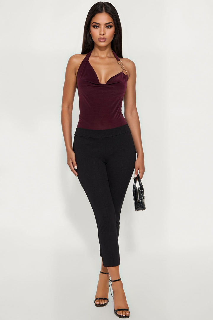 Available In Black And Burgundy. | Halter Top | Stretch | Hardware Detail | Cowl Neck | Self: 100% Polyester | Lining: 95% Nylon 5% Spandex | Imported
