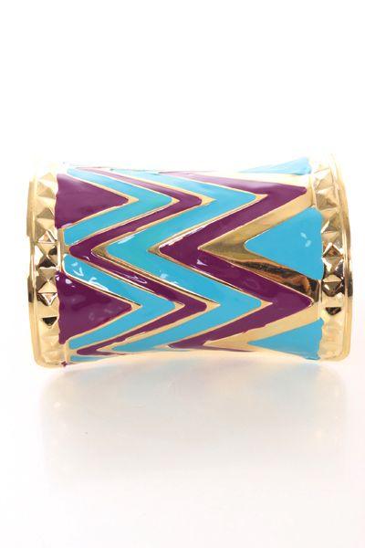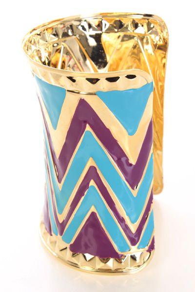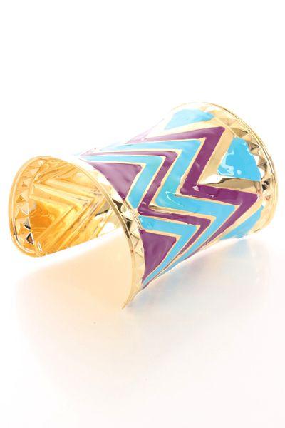 Deep down inside you have an exotic side, so let your love of all things wild shine bright when you slip on this statement zig zag-themed cuff! With unique retro charm, the high polished metal color of this longt cuff brandishes a shining, gold-trimmed, textured zig zag decor decor, and lacquer painted color reminding you to always follow your heart. Youll adore this lovely bracelet, particularly when paired with a mettalic party dress, enchanting earrings, and whimsical wedges! Let your true feelings lead you toward this wild adornment!