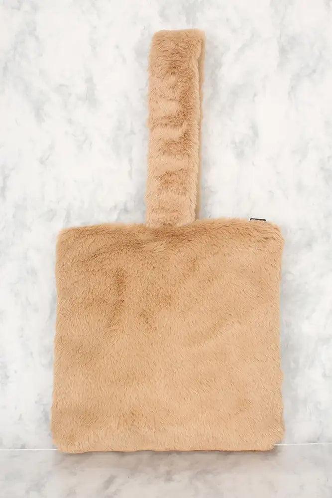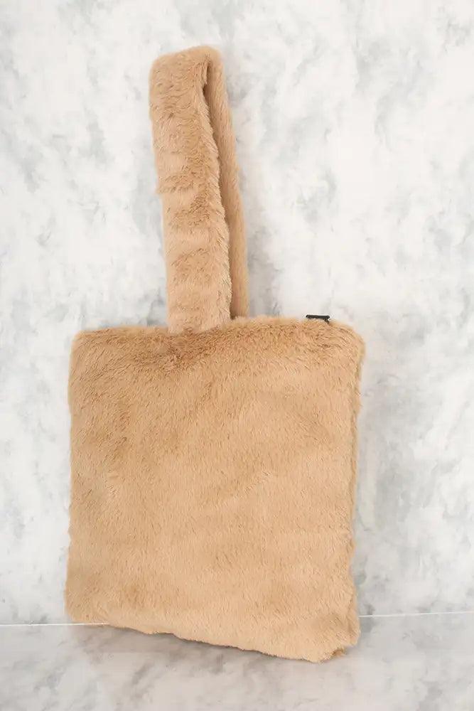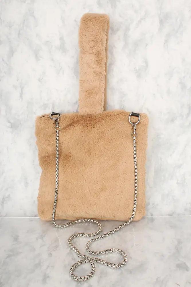 This cute tote bag is perfect for your outfit! Features include: a faux fur exterior with a faux leather interior, removable high polish shoulder chain, followed by a zipper closure. .5 inch depth, 9.5 inch width, and 9.5 inch length