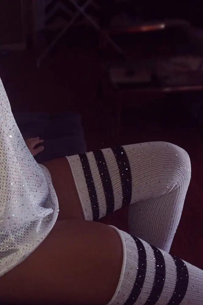 These sexy socks can make any outfit looks great! Featuring, pair of thigh high sock with stripes and rhinestone detail