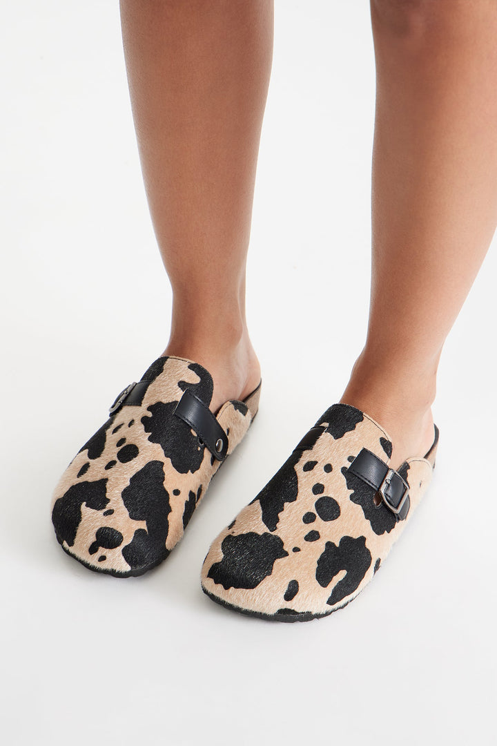 Acres Buckle Cow Print Slides - Black/combo