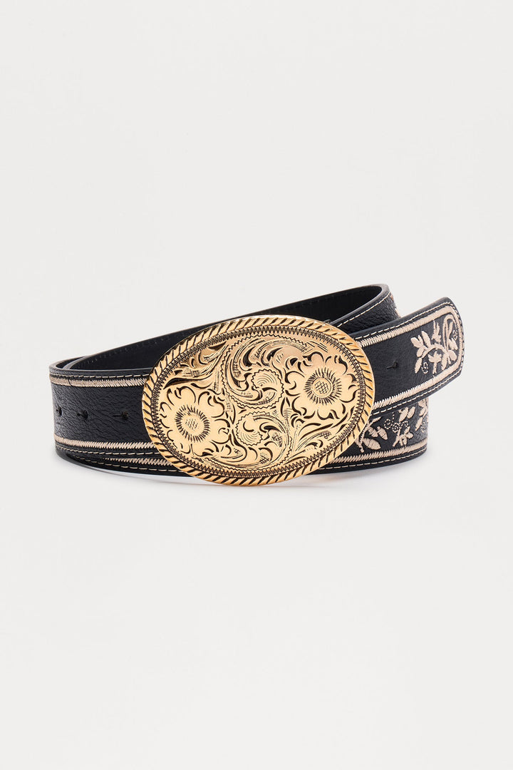 Available In Black/Gold. | Floral Detail | Faux Leather Material | Length: 43.5" | Imported