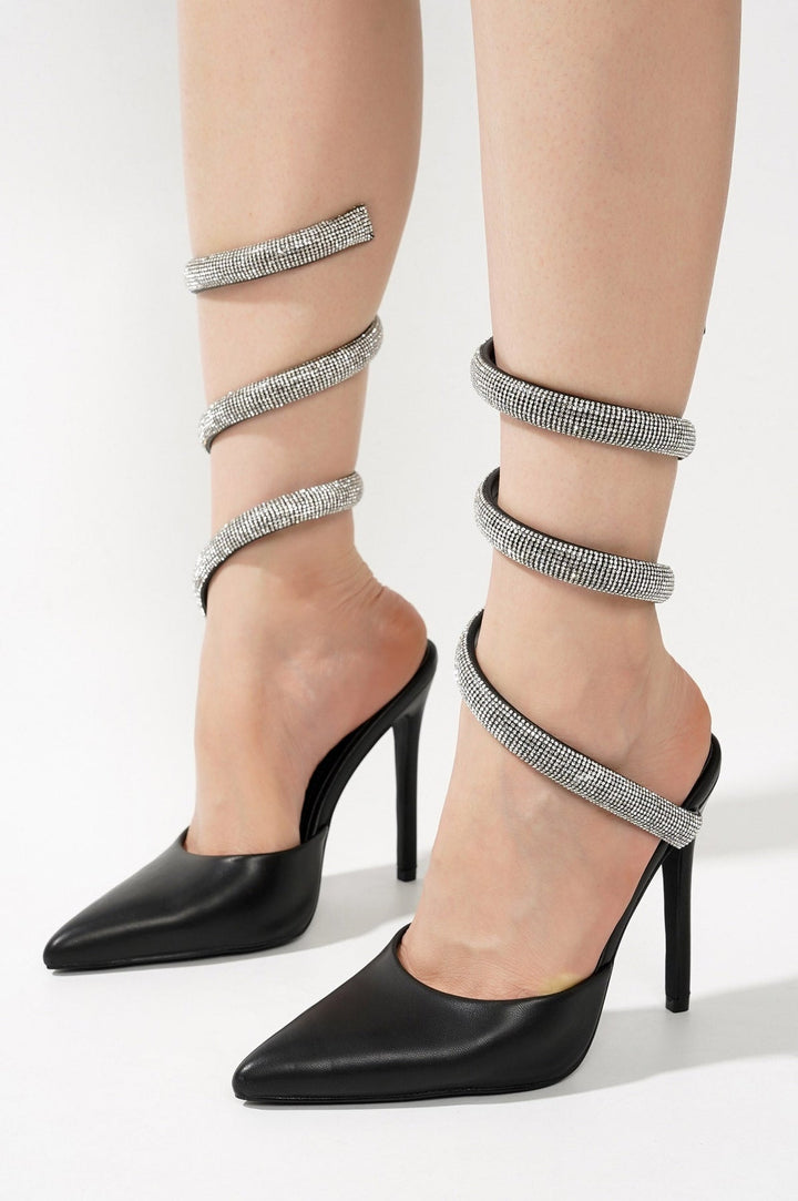 ADELLE - BLACK - HEELS by CAPE ROBBIN Stiletto heel: 4.5-inch Wrap around straps design PU leather insole with memory foam for added comfort Rhinestone embellished Pointed toe Dazzle in the Spotlight with Adelle rhinestone wrap around strappy stiletto Heels! Elevate your evening wear with the Adelle Transparent Rhinestone Heels. Whether attending a wedding, dinner, or any glamorous affair, these heels will ensure you dazzle with every step.