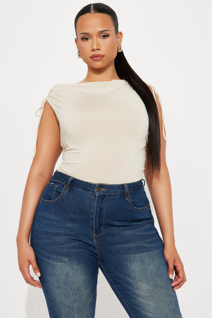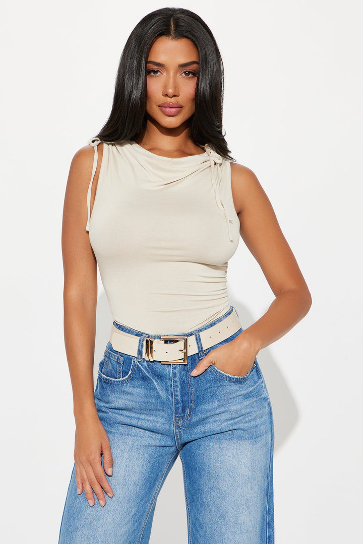 Available In Beige And Burgundy. | Bodysuit | Cowl Neck | Tie Shoulder Detail | Ruched Detail | Thong Bottom | Snap Button Closure | Stretch | self: 95% Rayon 5% Spandex | Imported