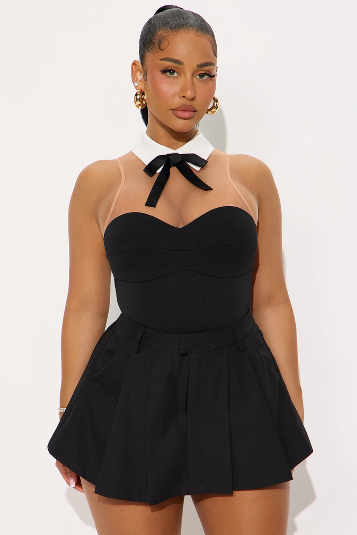 Available In Black/combo. | Bodysuit | Collar | Sleeveless | Bow Detail | Cheeky Bottom | Stretch | Final Sale | Self 1: 100% Nylon | Self 2: 95% Polyester 5% Spandex | Self 3: 60% Cotton 35% Nylon 5% Spandex | Lining: 100% Polyester | Imported