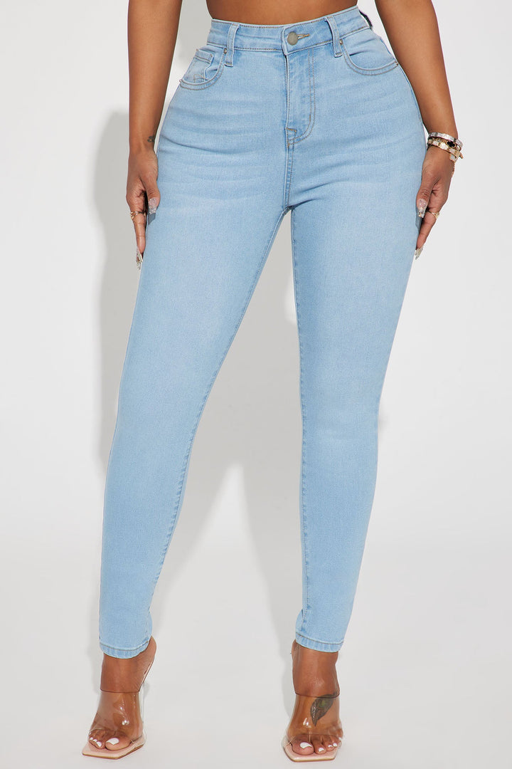 Available In Light Wash. | Available In 26" Petite Inseam, 29" Regular Inseam, And 32" Tall Inseam | Skinny Jean | Medium Stretch | 5 Pocket | 11" High Rise | Disclaimer: Due To The Specialized Wash Process, Each Garment Is Unique. | 54% Cotton 26% Polyester 18% Rayon 2% Spandex | Imported
