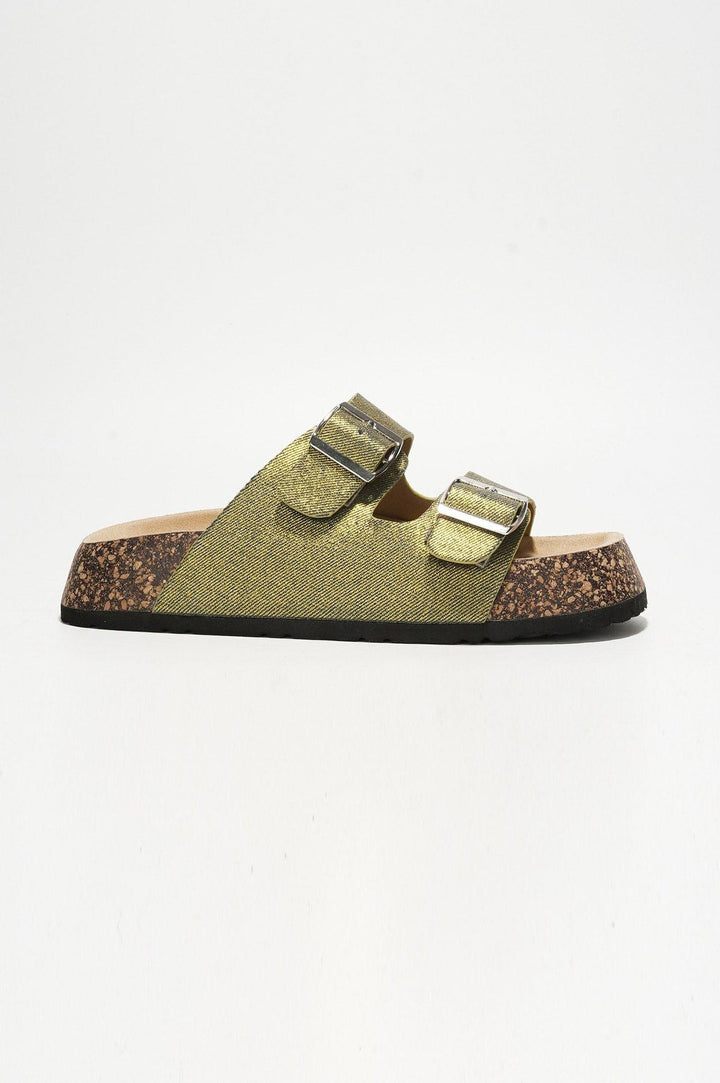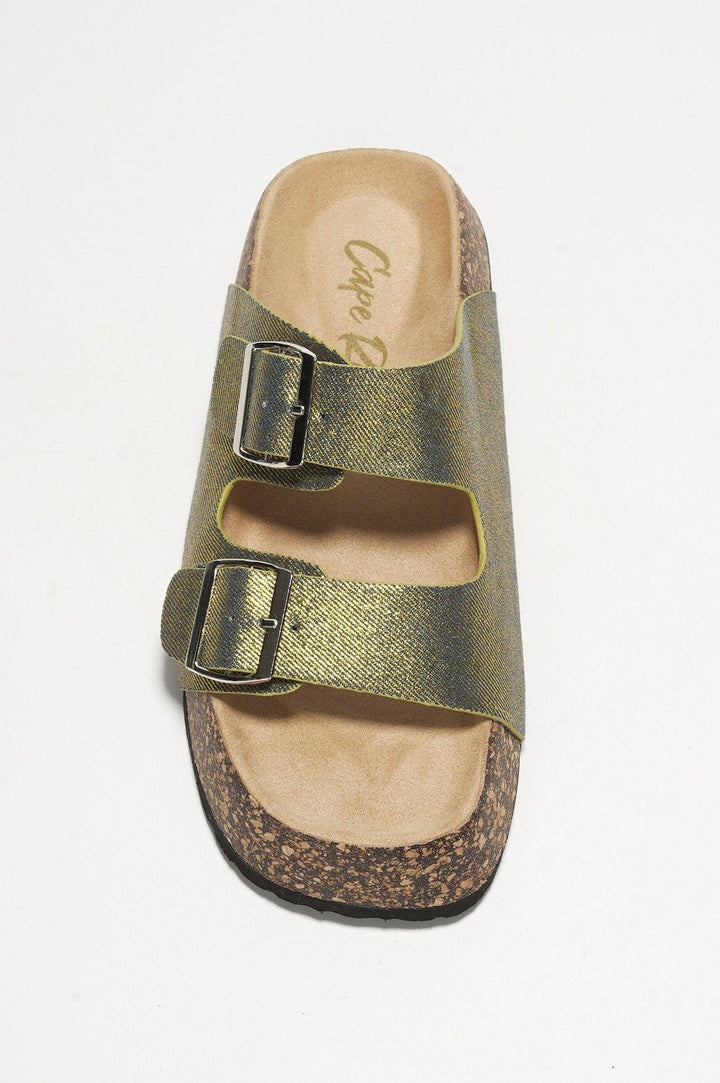 ALIA - GOLD - SANDALS by CAPE ROBBIN Heel: 1 inch Slip-on Contoured footbed with suedette insole Buckle strap Open toe Elevate your style with the Alia Sandals,a perfect blend of fashion-forward design and comfort! These sandals boast a contemporary flatform sole crafted from metallic fiber,adding a touch of futuristic flair to your ensemble. The chic buckle detail not only adds a trendy accent but also ensures a secure and adjustable fit.
